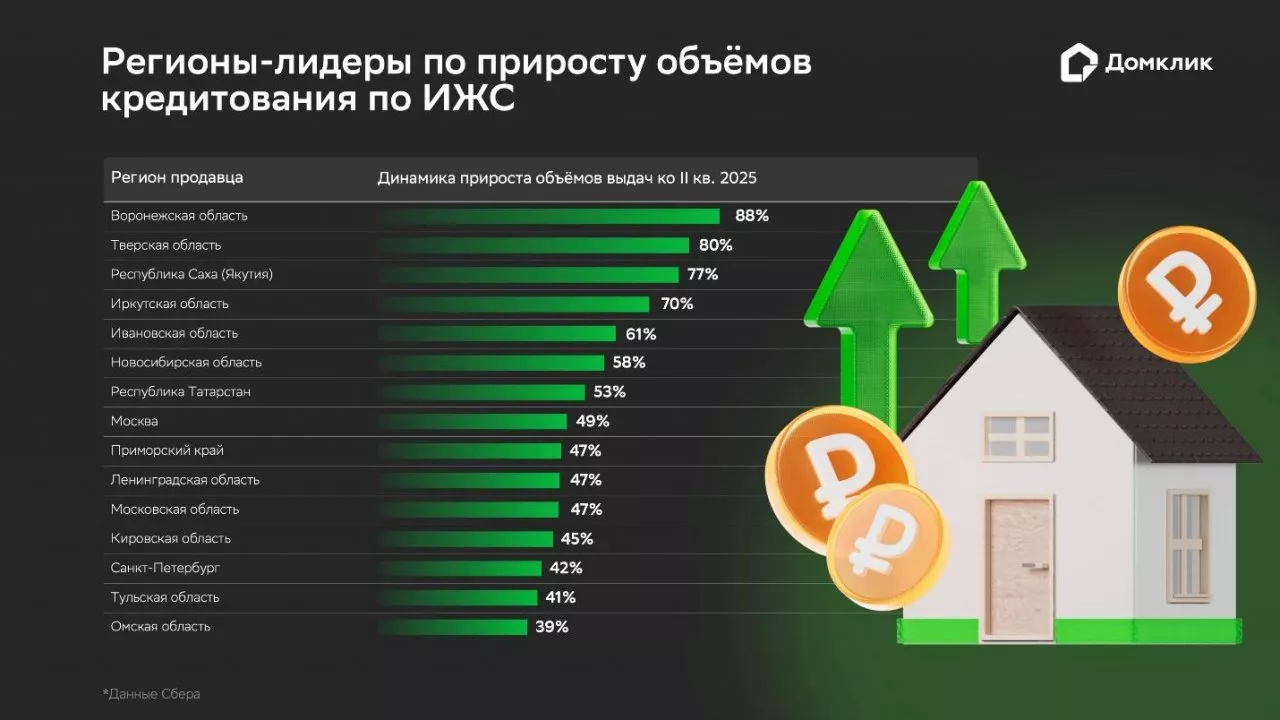 Оживление на рынке ИЖС, начавшееся во II кв. 2025 года, продлилось и в III кв., демонстрируя высокие темпы прироста во многих регионах. В тройку лидеров по увеличению объёмов кредитования в III кв. вошли Воронежская (88%) и Тверская (80%) области, а также Республика Саха (Якутия) (77%). Замыкают топ-15 Тульская и Омская области с показателями 41% и 39% соответственно.